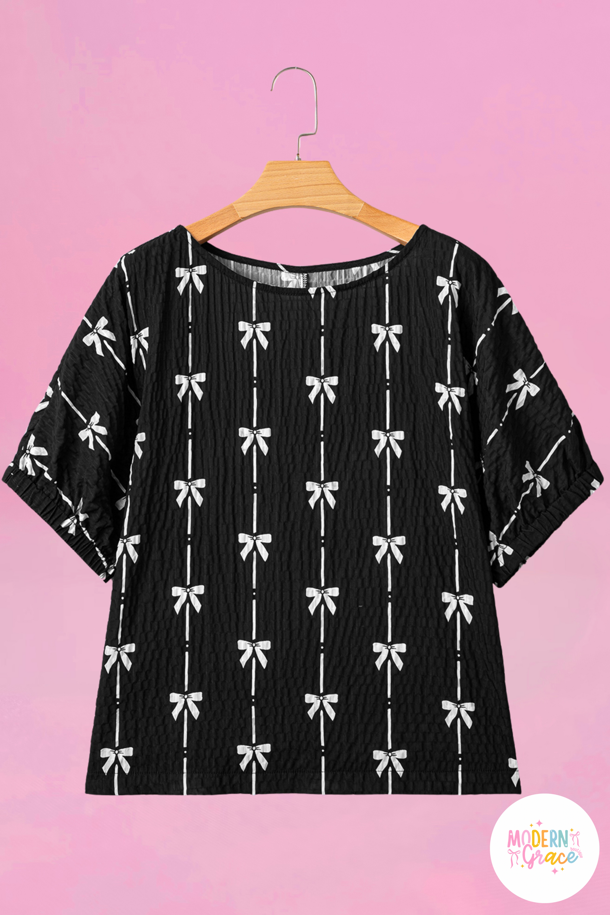 Elevate your style with this Black Bow Print Puff Short Sleeve Top. Playfully charming, it features delicate puff sleeves and a whimsical bow print that adds a flirty touch to your look. Perfect for mixing with jeans or a skirt, this top brings fun and flair to any outfit.