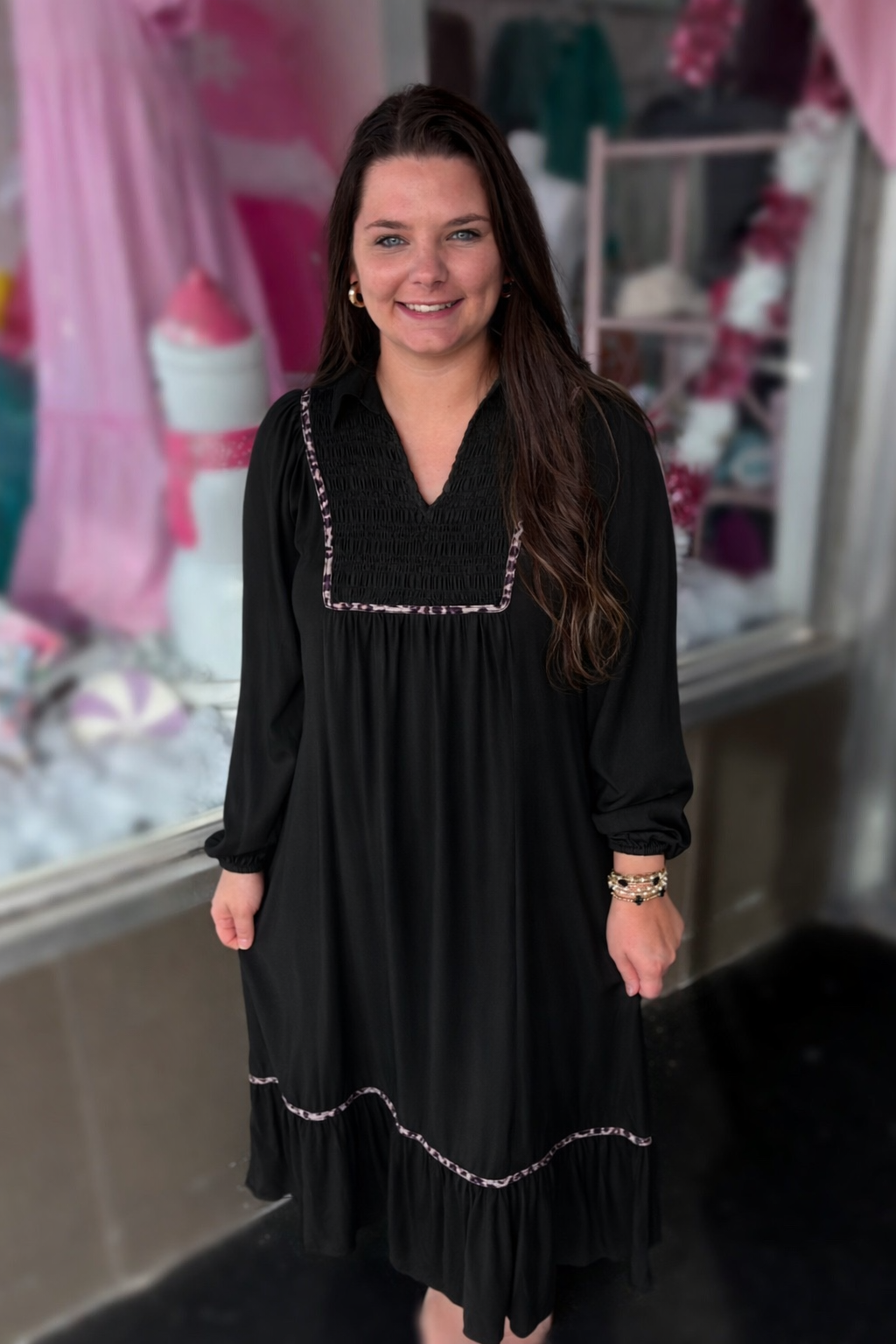 Elevate your wardrobe with this show-stopping maxi dress that effortlessly blends sophistication with fun. The classic black silhouette features a flattering V-neckline and collared detail, while delicate smocking adds texture and movement. The unexpected leopard trim brings a playful pop of personality to the hem, making this the perfect piece for turning heads at any occasion. Dress it up with heels and jewelry or keep it casual with sneakers—this versatile stunner works for everything from brunch to evening events.