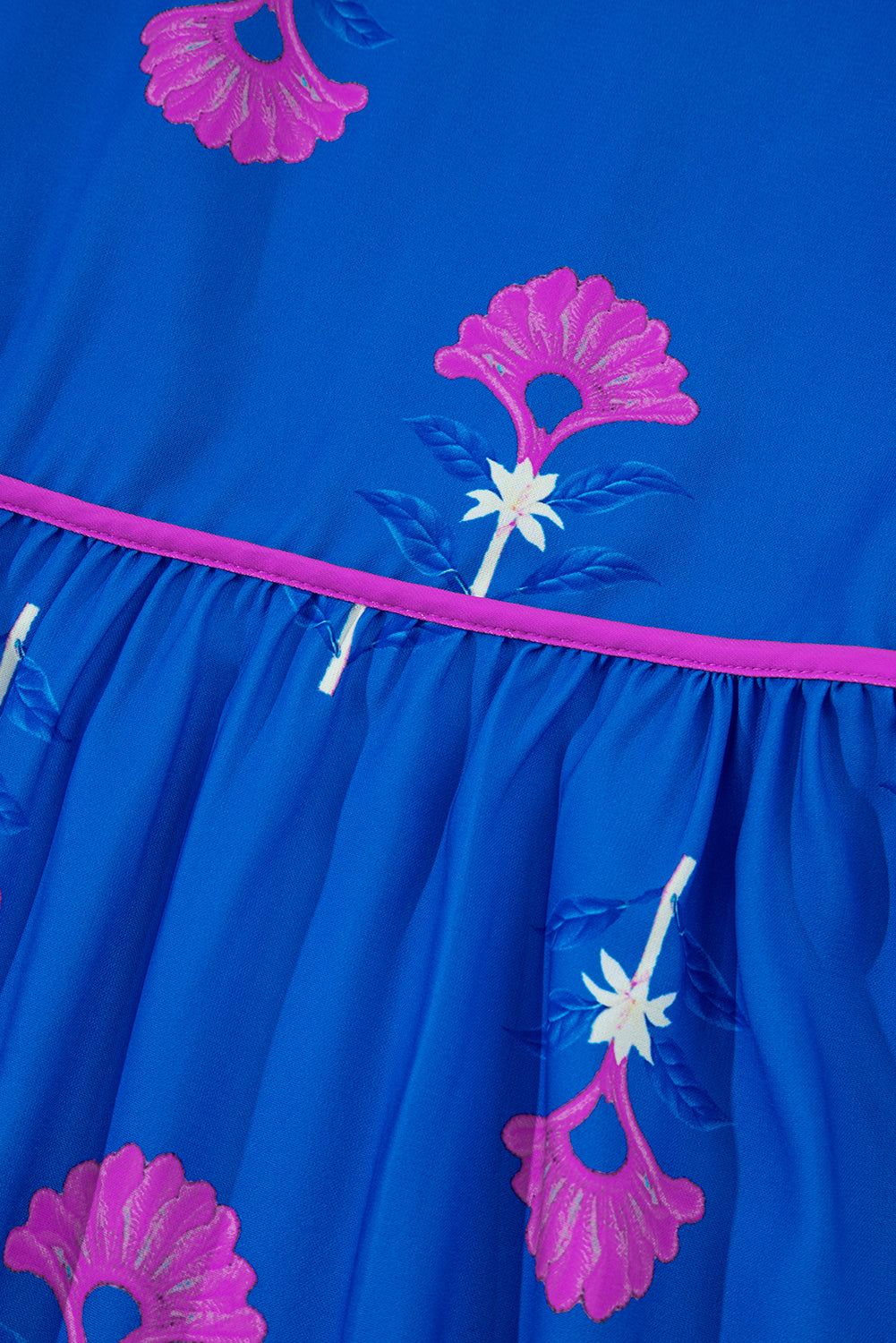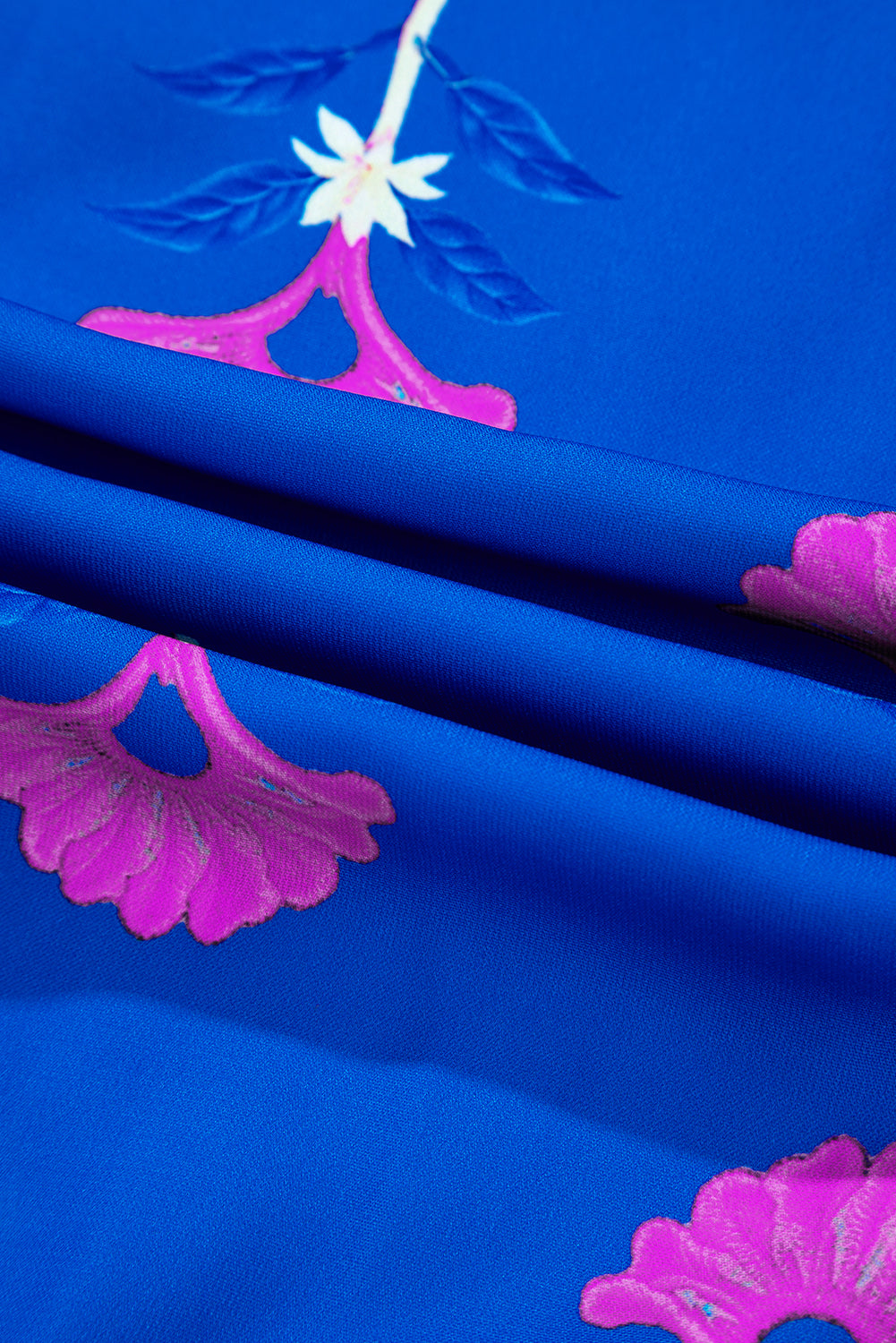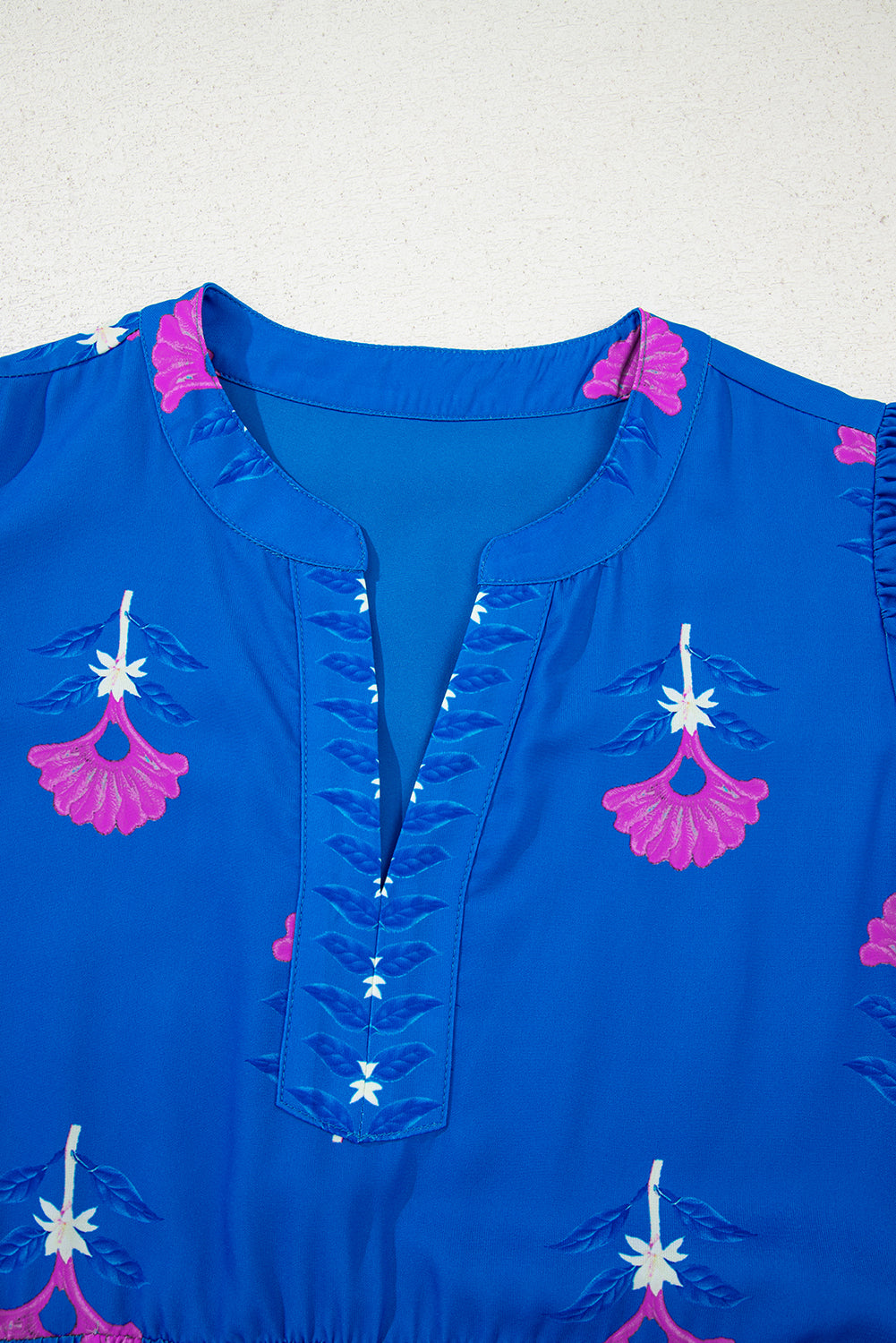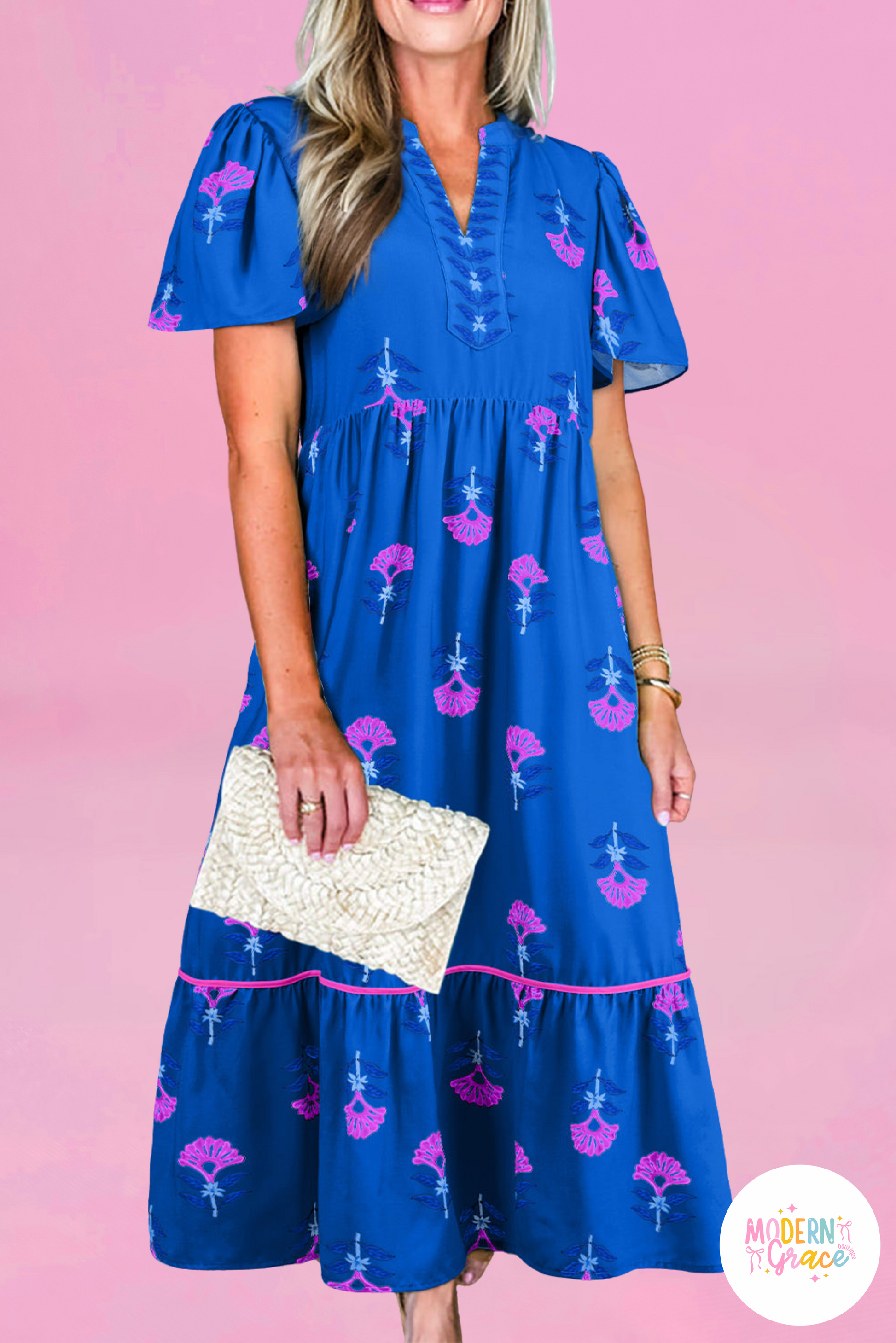 Blue Floral Print Notched Neck Butterfly Sleeve Shift Long Dress (Warehouse Exclusives)