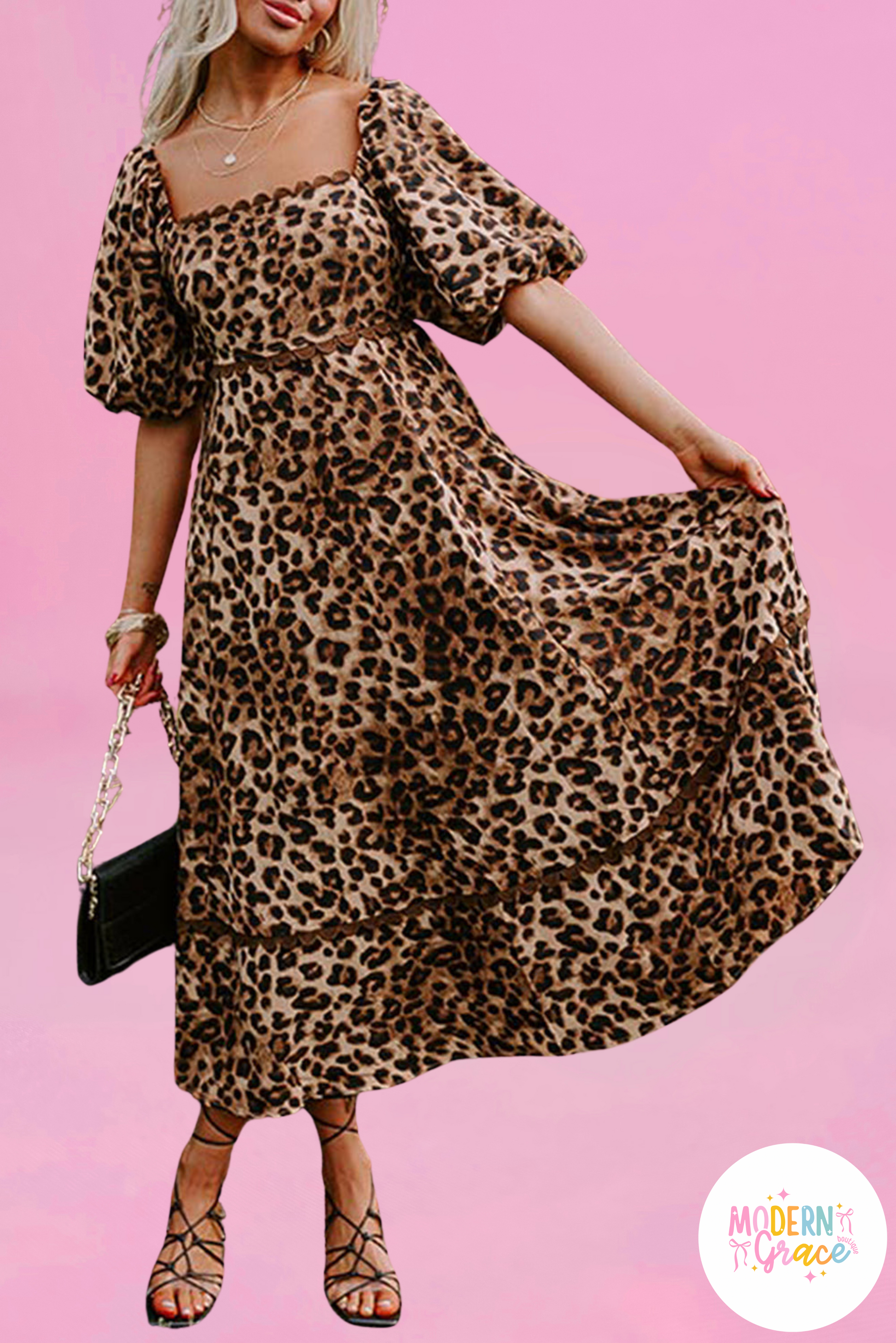 Brown Leopard Print Bubble Sleeve Square Neck Maxi Dress (Warehouse Exclusive)