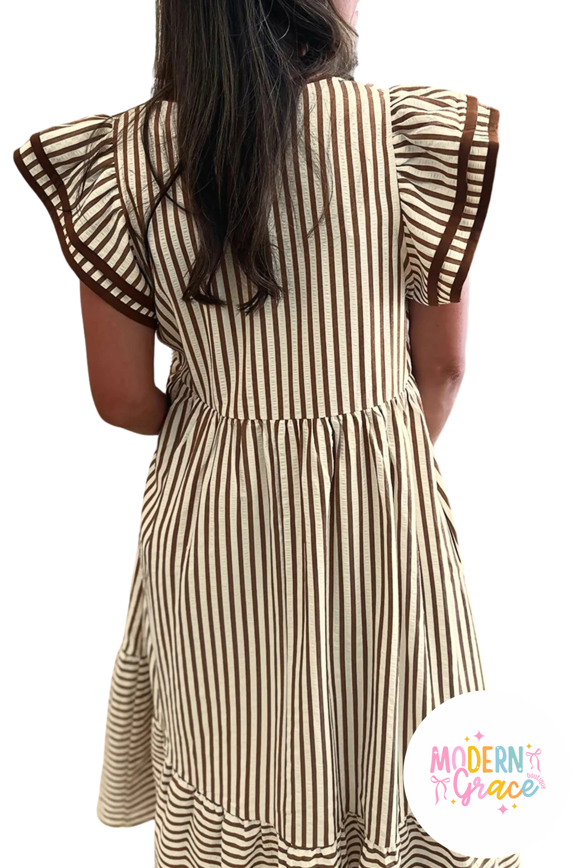 Elevate your warm-weather wardrobe with this charming brown striped midi dress! The double ruffled short sleeves bring a playful, feminine touch, while the V-neckline flatters every frame. Contrast trim details add modern sophistication to this breezy piece. Whether you're heading to brunch, the office, or weekend adventures, this versatile dress keeps you cool and effortlessly stylish all season long.