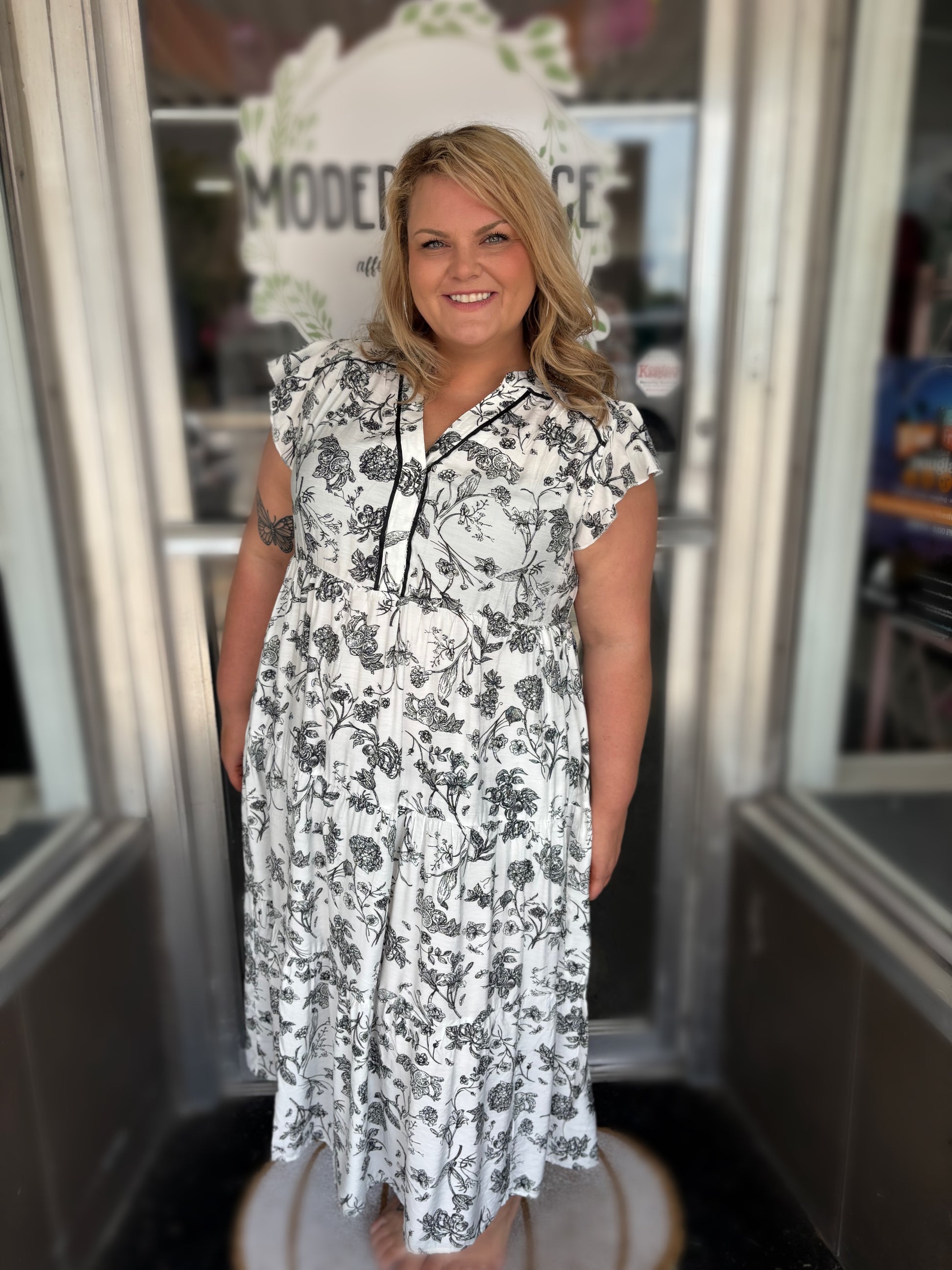 Turn heads in this CURVY Black Floral Print Maxi Dress, where flirty ruffle sleeves meet a flowing silhouette designed to celebrate every curve. Its bold floral pattern adds a pop of playful charm, making it perfect for summer days or evening strolls. Effortless to wear and impossible to ignore!