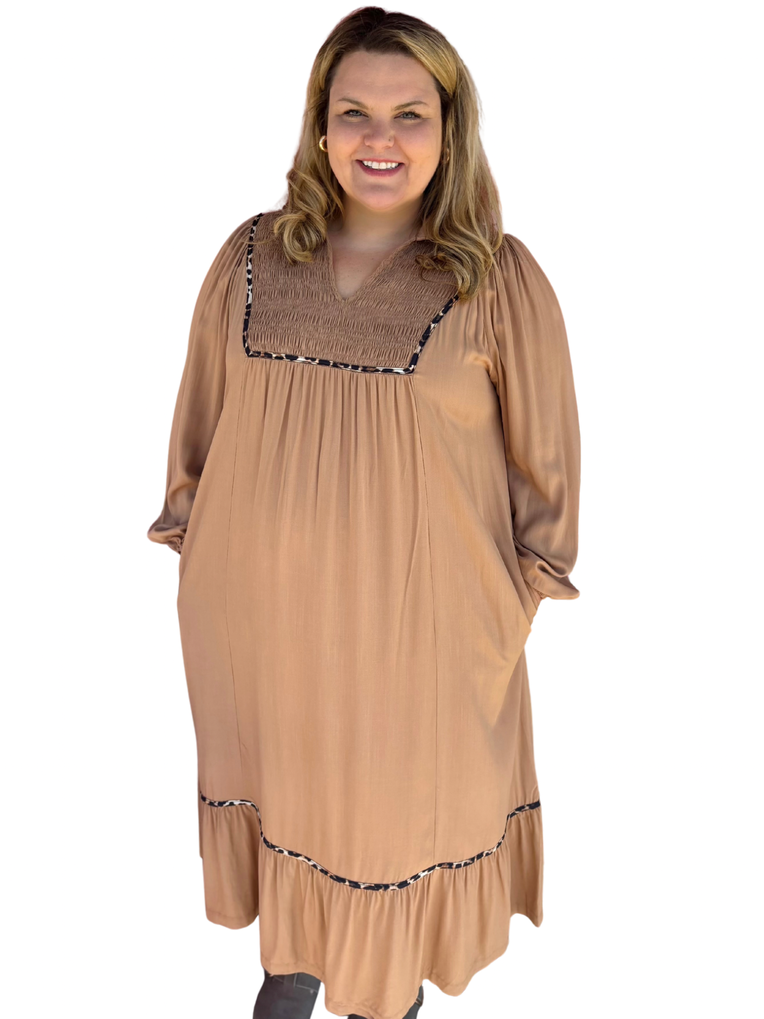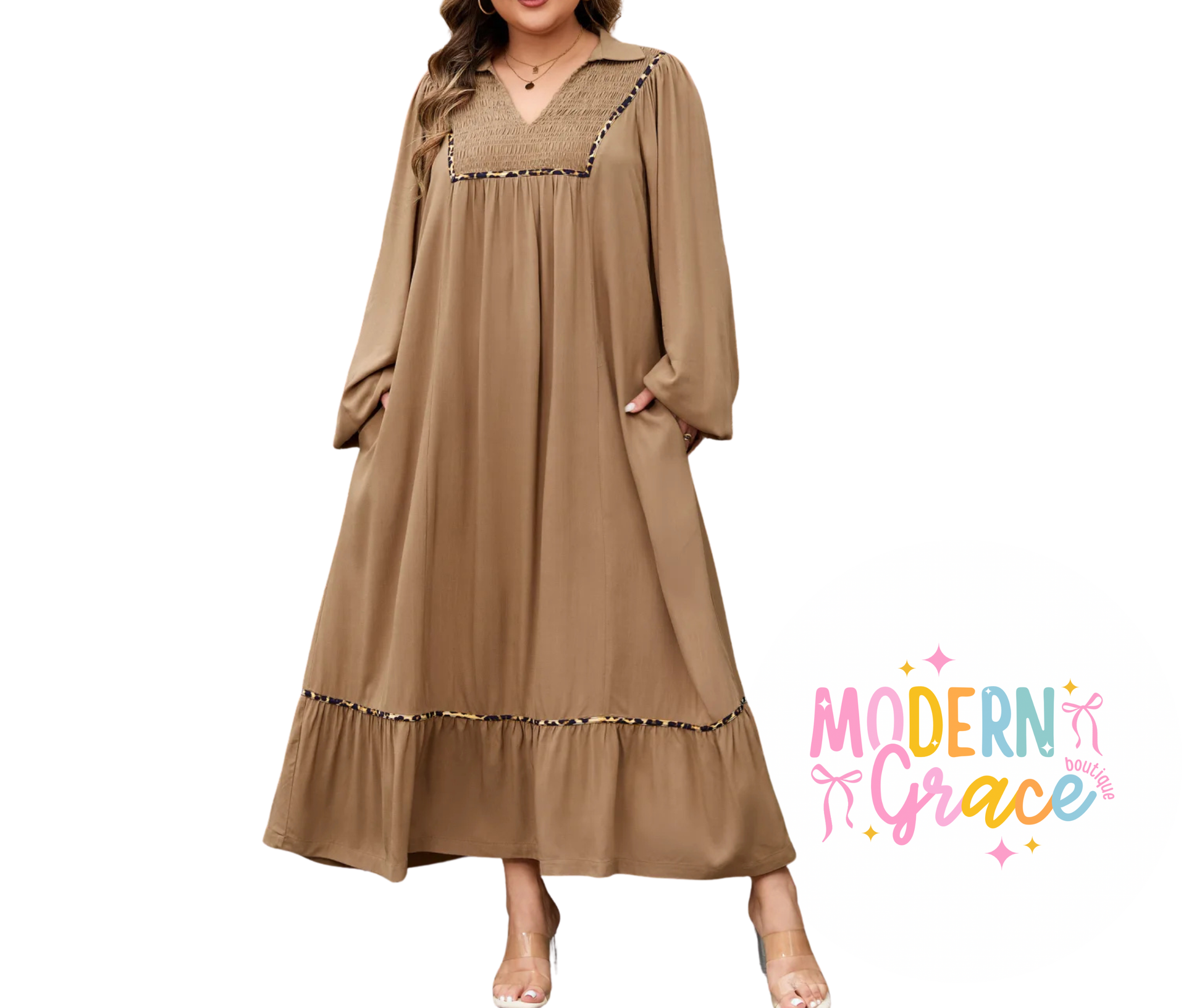 Embrace your bold side in this mocha maxi dress, where leopard piping details bring a wild-and-free edge to everyday elegance. The smocked bodice delivers comfort without sacrificing style, while the relaxed fit and bracelet sleeves keep things effortlessly chic. Whether you're heading to the office, a holiday gathering, or just living your best life, this versatile piece transitions seamlessly from day to night. Designed for curves, designed for confidence.