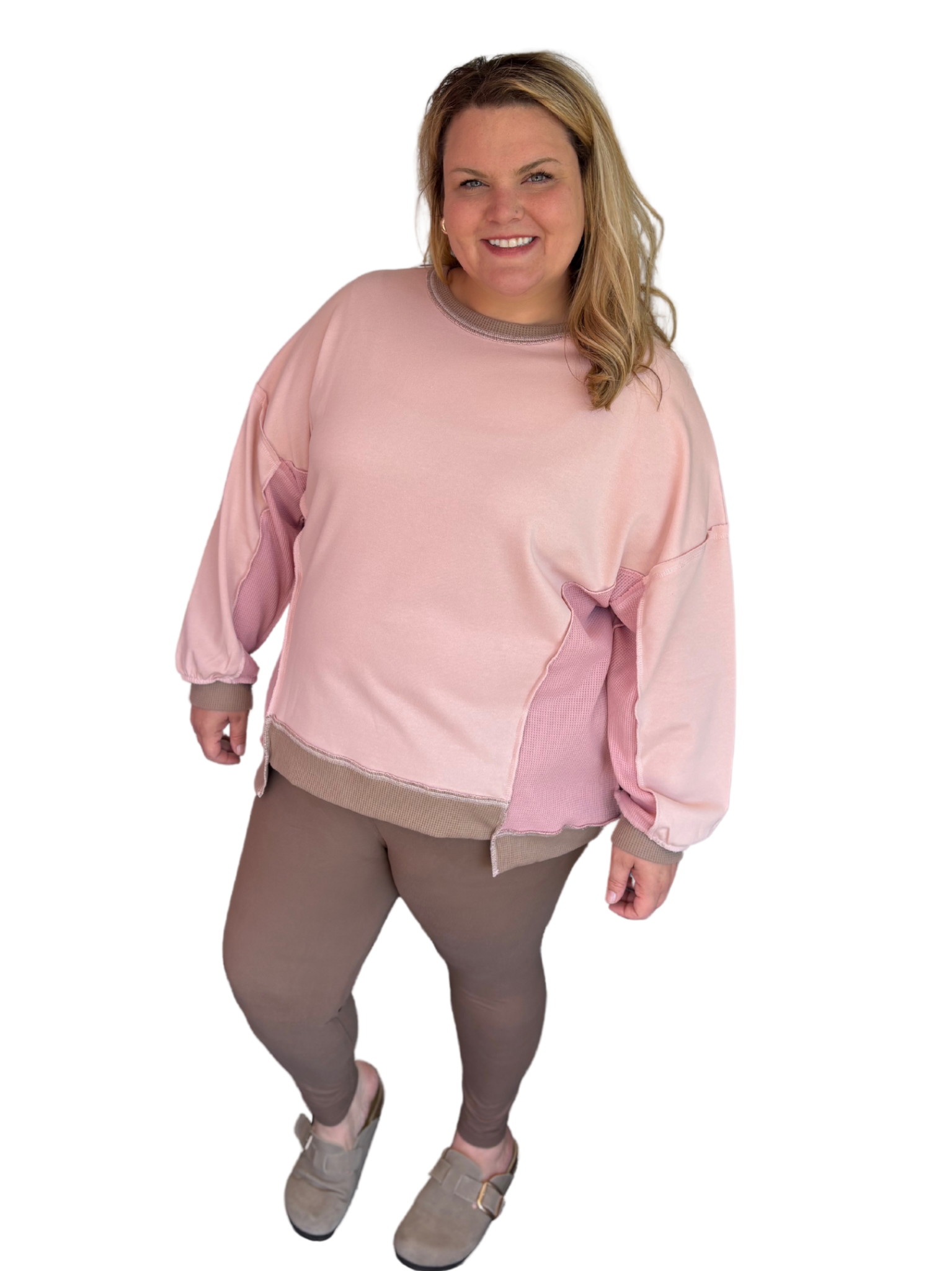 Curvy Light Pink Color Block Waffle Patchwork Exposed Sea Sweatshirt (Size up for baggy fit)