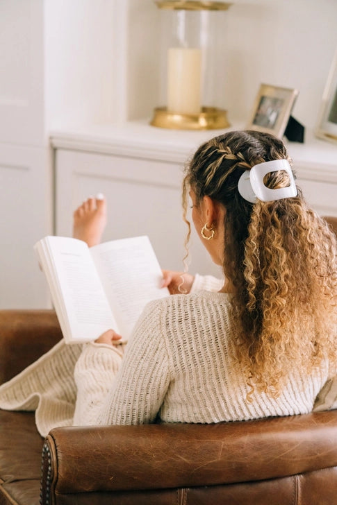 Lay flat and relax with the new TELETIES Coconut White Large Flat Round Hair Clip in Coconut White. This hair clip is designed to allow you to lay back flat, do yoga, or sit comfortably in a seat with a headrest, and it is made with the same material that is nearly unbreakable. Lay down flat with comfort Bendable teeth for a secure yet gentle hold Lightweight, durable, and hair-friendly Perfect for all-day wear—from sunup to sundown The large size is great for thick hair. The large clip is 4.5 inches long.