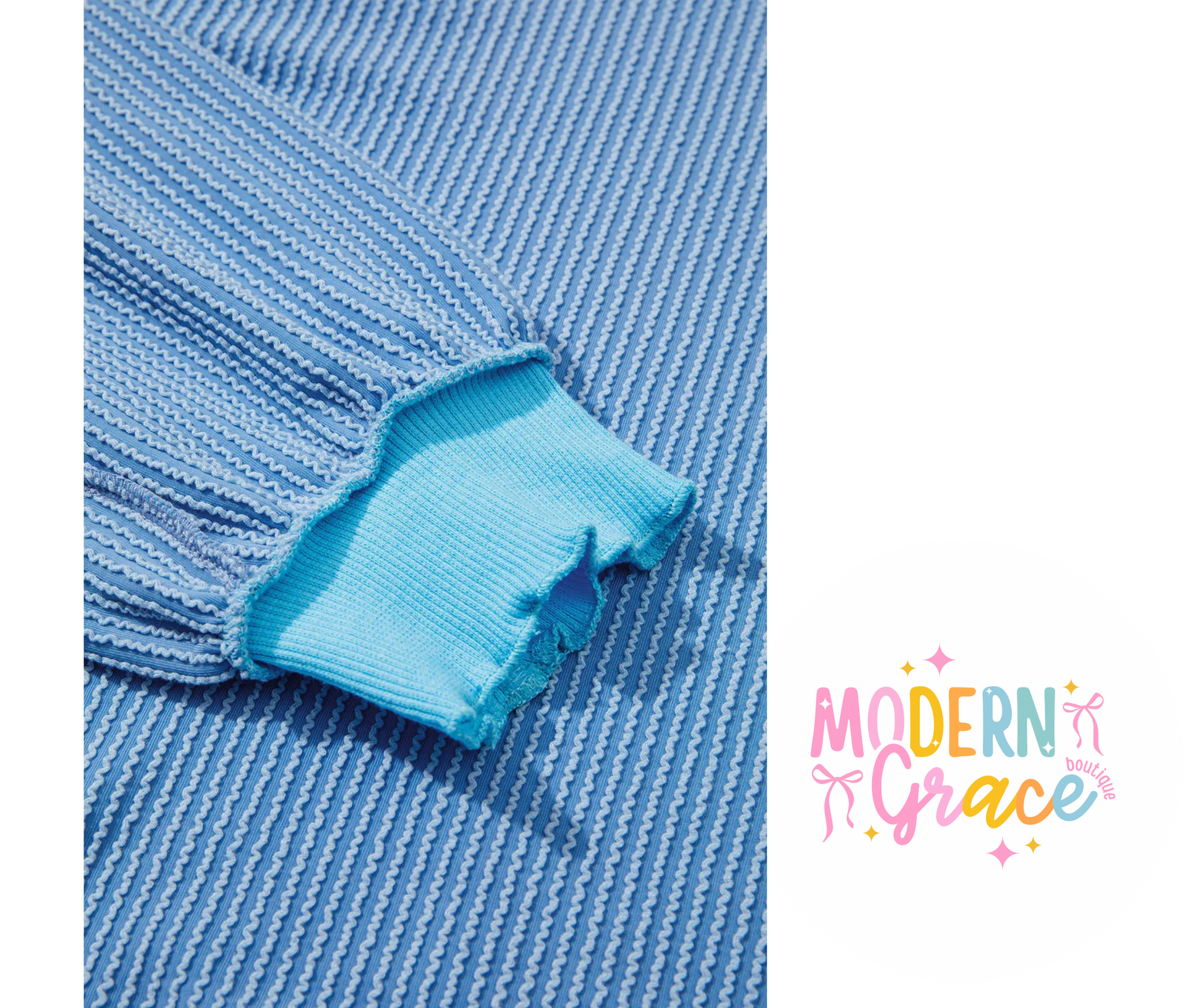 Effortless style meets cozy comfort in this sky blue twisted rib top. The drop shoulder cut and uneven hem create an undeniably cool, modern vibe that works with everything from your favorite jeans to weekend joggers. Textured knit fabric keeps things interesting while staying lightweight and breathable—perfect for layering or wearing solo. A versatile piece that feels as good as it looks.